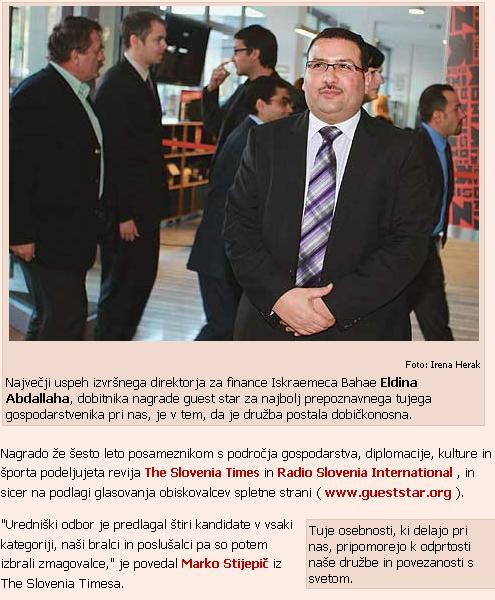 Gospod Bahaa Abdullah, izvršni direktor za finance v Iskraemeco, je prejemnik nagrade guest star 2009 za najbolj prepoznavno tujo osebnost pri nas.